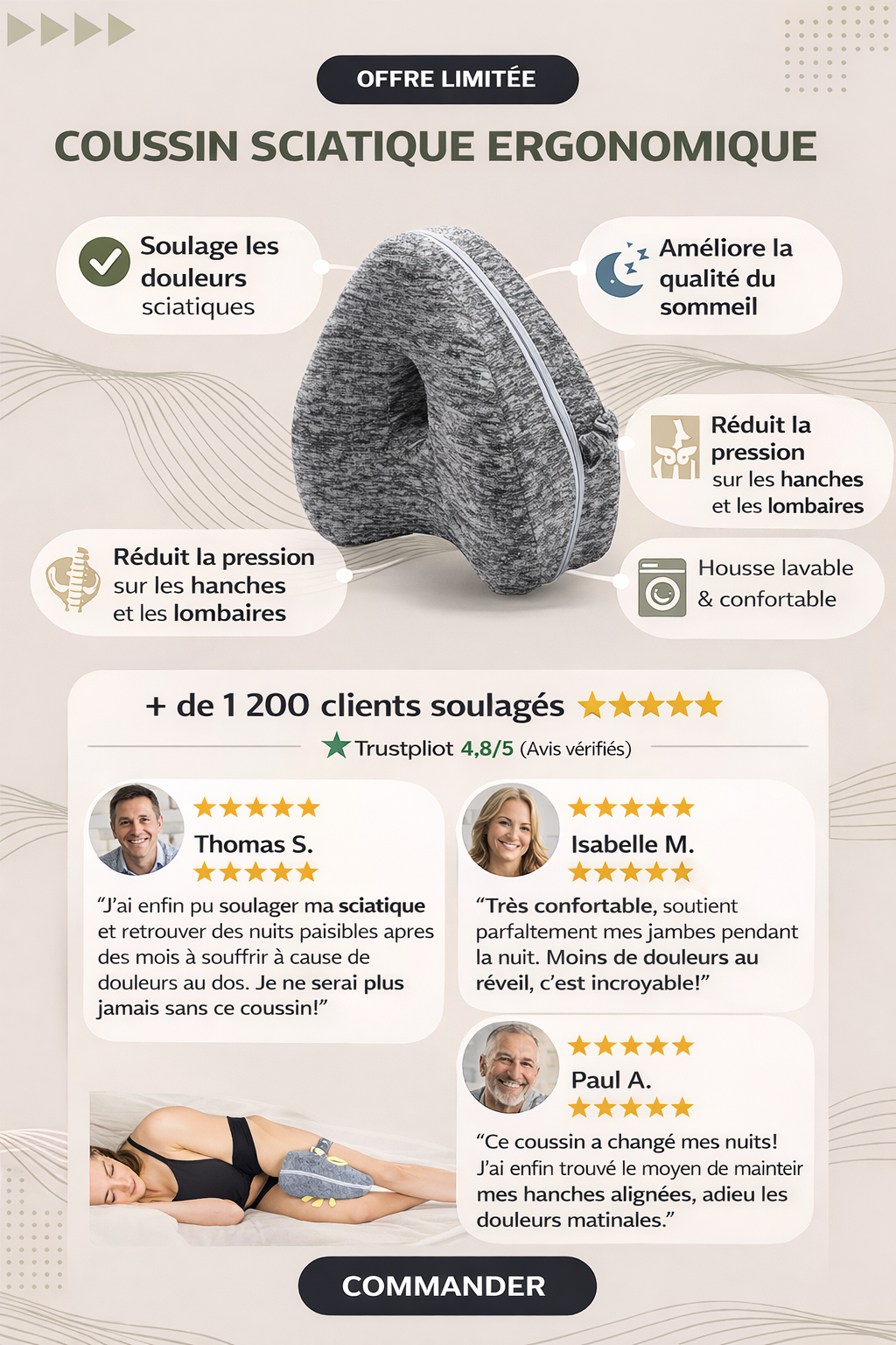 Des hommes et des femmes souffrant de sciatique, de douleurs lombaires ou de hanches témoignent d’un soulagement réel dès les premières nuits. Vous pourriez être le prochain.