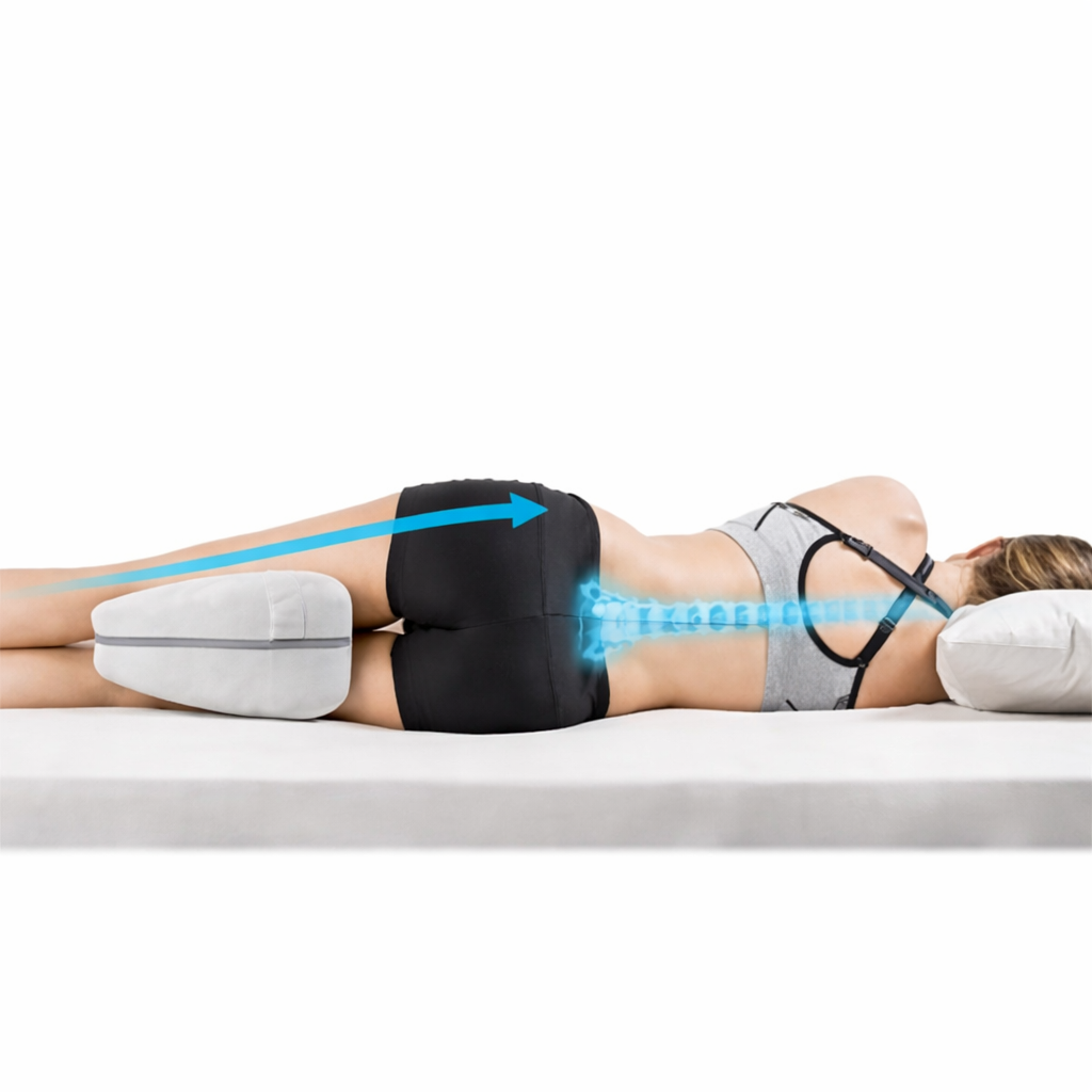 Il suffit de placer le coussin entre vos jambes lorsque vous dormez sur le côté. Il maintient vos hanches alignées et réduit la pression sur la colonne vertébrale pendant toute la nuit.